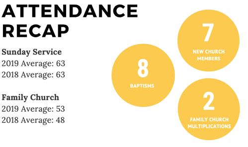 If you look at the beautifully made pamphlet (Thanks Kristin!) you will see that our average attendance on Sunday in 2018 was exactly the same in 2019 (63). The Family Church attendance increased a bit, which is encouraging.